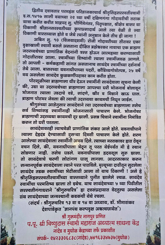 येथे श्रीदत्तात्रेयाचे मंदिर आहे. मंदिरातील मूर्ती अतिशय सुंदर आहे. या मंदिराच्या मागच्याच बाजुला श्रींचे शिष्य श्री सायंदेवस्वामींचे घर असून त्यांचे वंशज येथे राहतात. श्रीगुरुचरित्राचे लिखित प्रकटीकरण श्रींचे प्रिय शिष्य श्री सायंदेवस्वामींच्या पाचव्या पिढीतील श्री गंगाधर सरस्वती यांनी या ठिकाणी केले. श्रींच्या चरित्राची पहिली मूळप्रत सायंदेवांचे वंशज श्री कुलकर्णी (साखरे) यांच्याकडे बरीच जीर्णावस्थेत असली तरी आजही जपून ठेवण्यात आलेली आहे. ही मूळप्रत श्रीभक्तांना दर्शनासाठी श्री सायंदेवस्वामींच्या घरातील देवघरात ठेवण्यात आलेली आहे. त्याचे छायाचित्र सोबत जोडलेले आहे.