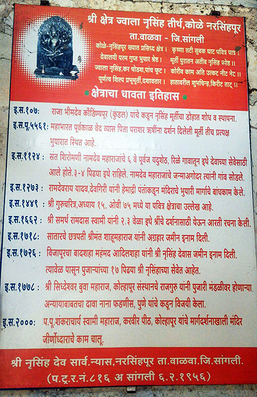 श्रीगुरुचरित्राच्या १५ व्या अध्यायात श्रींनी आपल्या शिष्यांना ज्या तीर्थक्षेत्रांची यात्रा करून येण्यास सांगितले त्यापैकी कृष्णानदीच्या काठी असेलेल्या कोल्हग्राम (नरसिंहपूर, जि.सांगली) तीर्थक्षेत्राच्या नरसिंहदेवाचा उल्लेख केलेला आहे. येथील श्री नरसिंव्हाच्या मूर्तिचे छायाचित्र सोबत जोडलेले आहे. त्यात श्री नरसिंव्हाची प्रभावळ स्पष्टपणे दिसते. या क्षेत्राची विस्तृत माहिती देणारा फलक या मंदिरात लावलेला आहे. त्याचे छायाचित्र भक्तांना या क्षेत्राचा परिचय व्हावा यासाठी सोबत जोडलेला आहे.