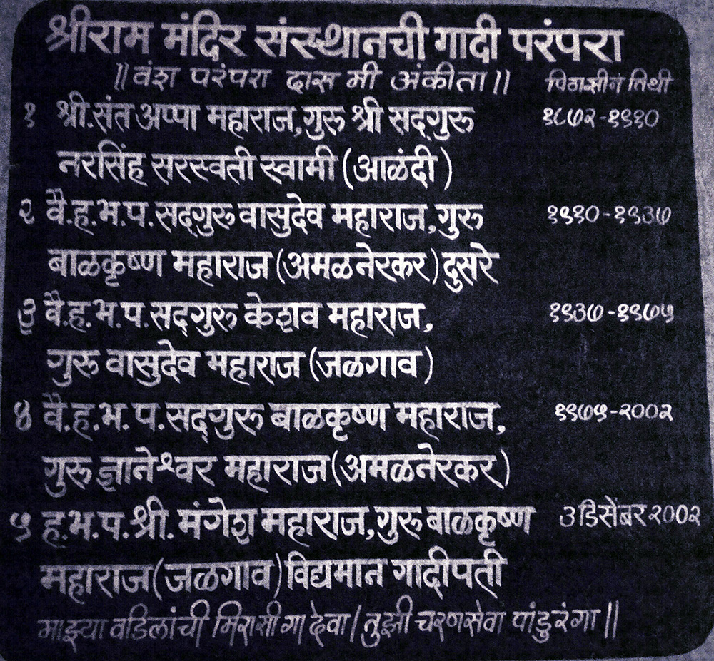 जळगांव:- जळगांवच्या जुन्या श्रीराम मंदिराचे पहिले महाराज श्रीसंत अप्पा महाराज यांचे गुरू श्री महाराज होते. तसा स्पष्ट लेखी उल्लेख येथे आहे. विशेष बाब म्हणजे ह्या मंदिराकडून आळंदीच्या उत्सवासाठी रथ देण्यात आलेला आहे. ह्या मंदिरात श्रींचे मोठे छायाचित्र आहे. संबंधित स्थानांची छायाचित्र सोबत जोडलेली आहेत.