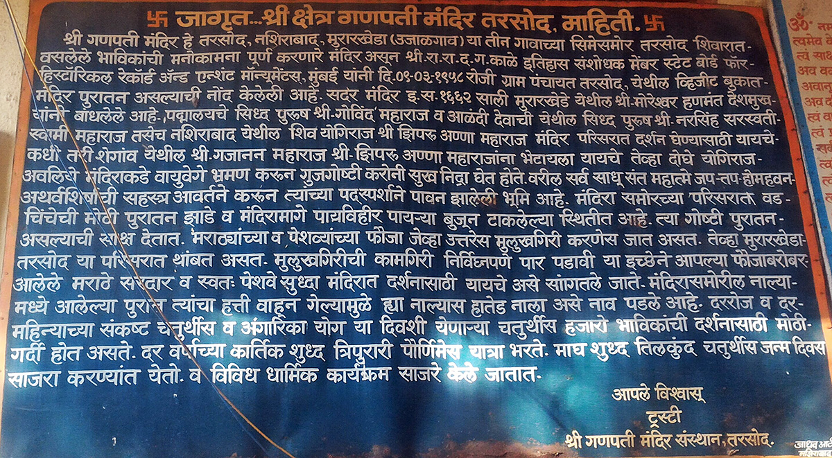 थाळनेर:- शिरपूरपासून १२-१५ किलोमीटर अंतरावर थाळनेर गांव आहे. गांव पुरातन असून त्या ठिकाणी श्री भावे परिवाराचे एक जुने गणेश मंदिर आहे. सध्या श्री मोरेश्वर भावे हे मंदिराची संपूर्ण व्यवस्था पाहतात. श्री मोरेश्वर भावे यांचे पणजोबा – श्री महिपती भावे यांना श्रींनी तापी नदीकाठी अनुग्रह दिली व त्यानंतर लगेचच श्री अदृश्य झाले. त्या प्रसंगानंतर गणेश मंदिर बरेच भरभराटीस आले. ह्या मंदिरात दर्शनी भागातच श्रींचे छायाचित्र आहे.